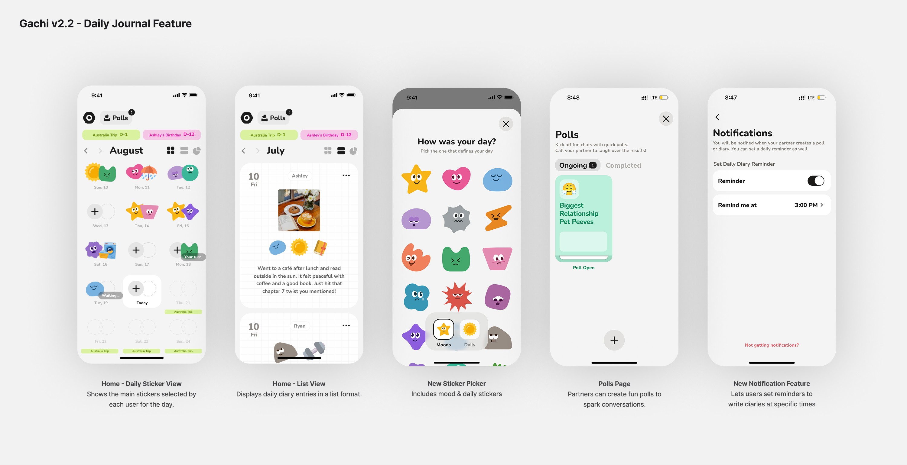 To make journaling expressive, I designed a system of mood and daily stickers, drawing inspiration from popular mood tracker apps in Asia and my own experience noticing how differently my partner and I express moods day-to-day.Polls Repositioned